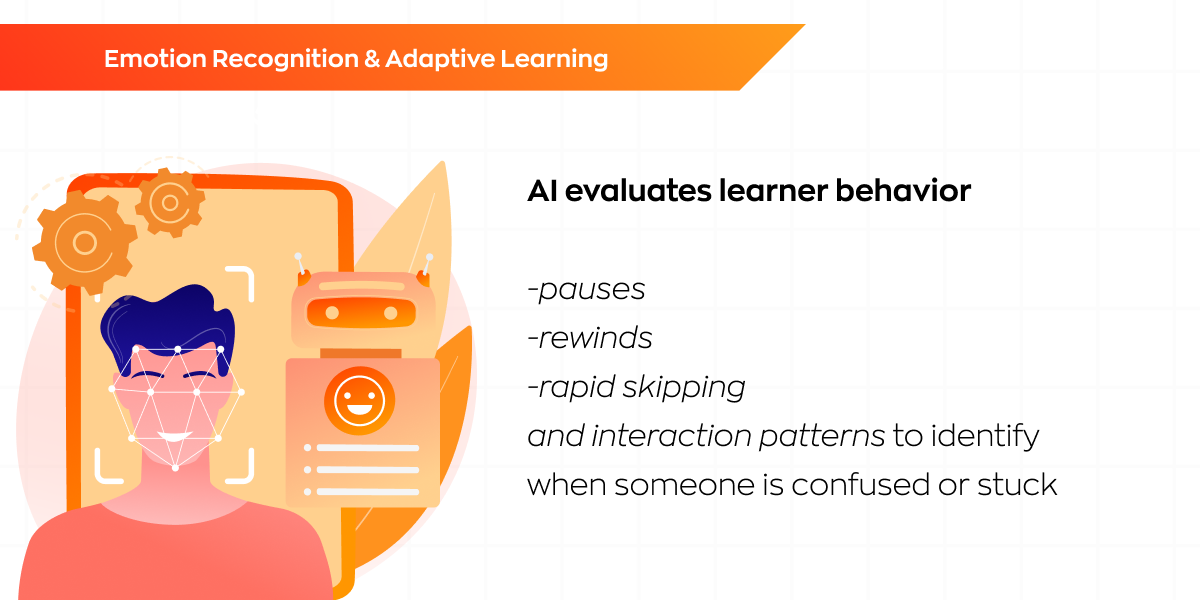 AI solutions evaluate learner behavior: pauses, rewinds, rapid skipping, and interaction patterns to identify when someone is confused or stuck. The system adjusts the lesson automatically to keep the learner progressing.