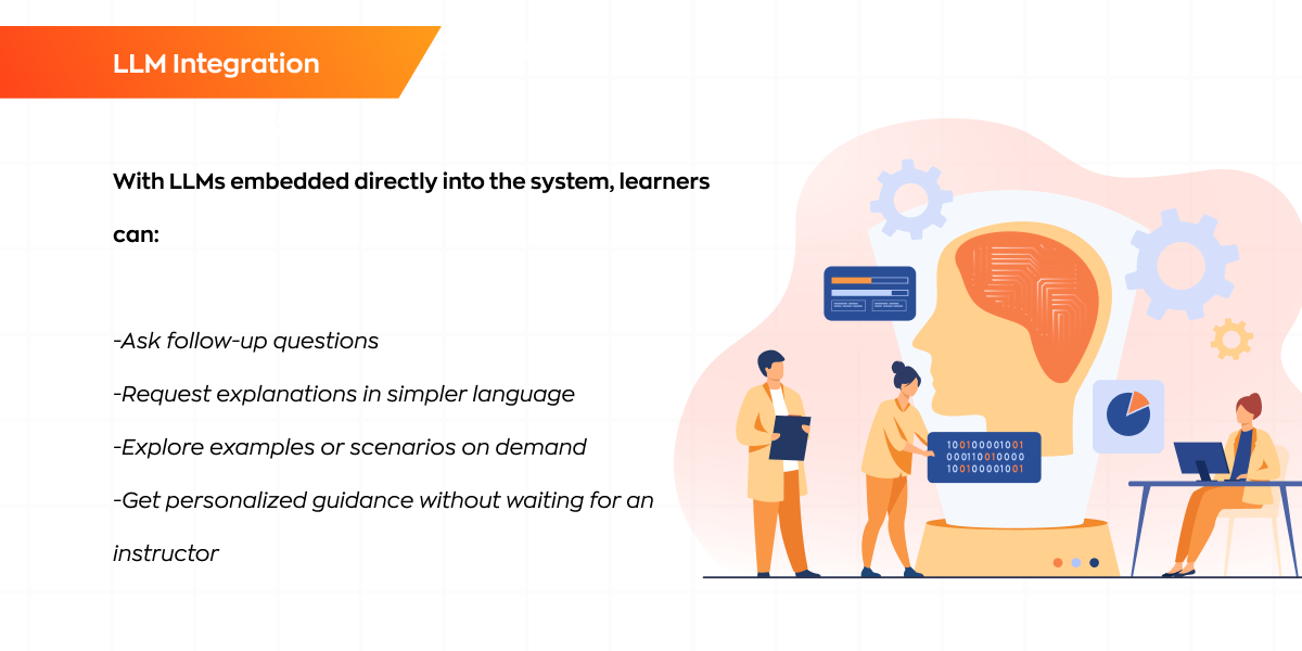 Large Language Models (LLMs) like GPT, Claude, and Gemini bring human-like reasoning, explanation, and content understanding into eLearning platforms. With LLMs embedded directly into the system, learners can: